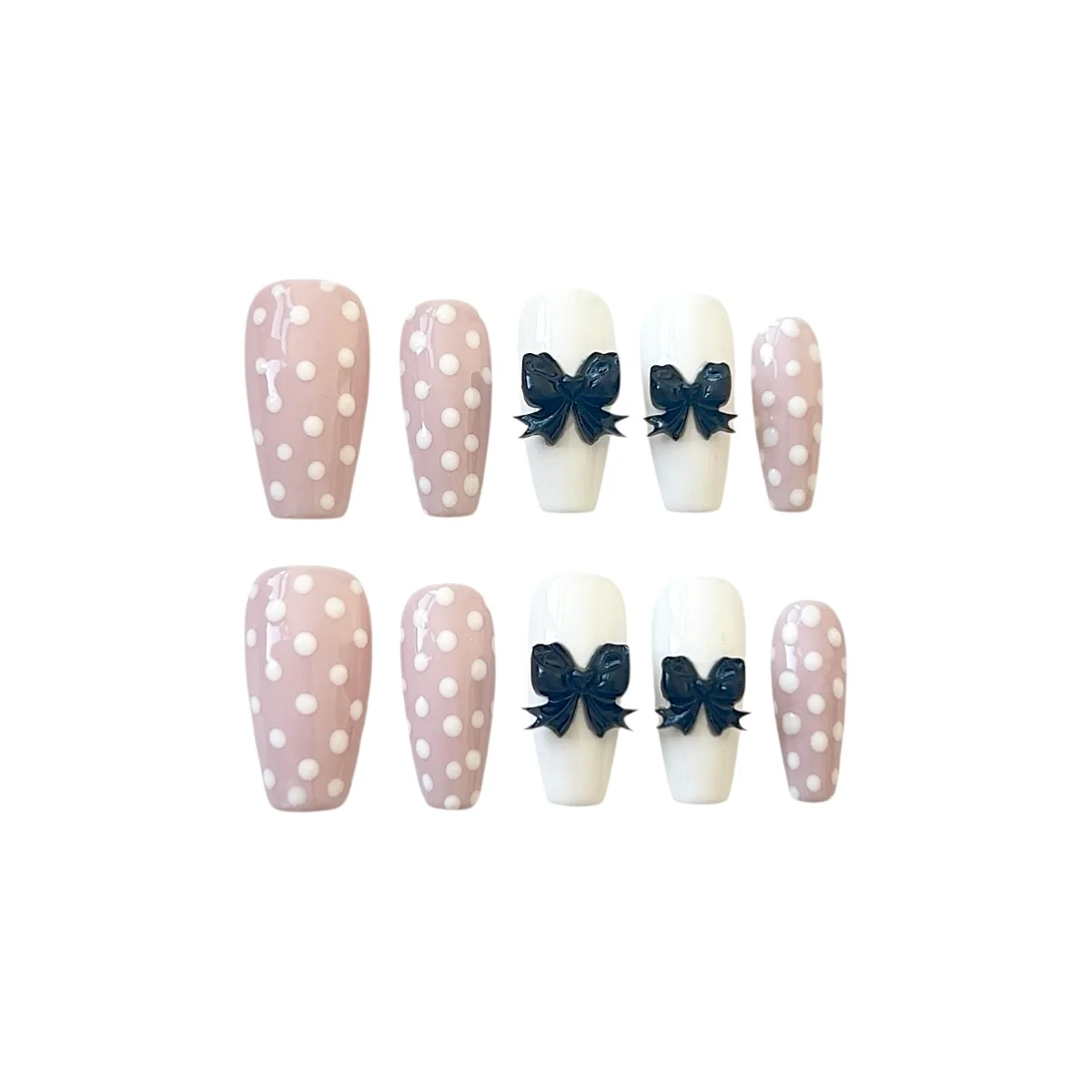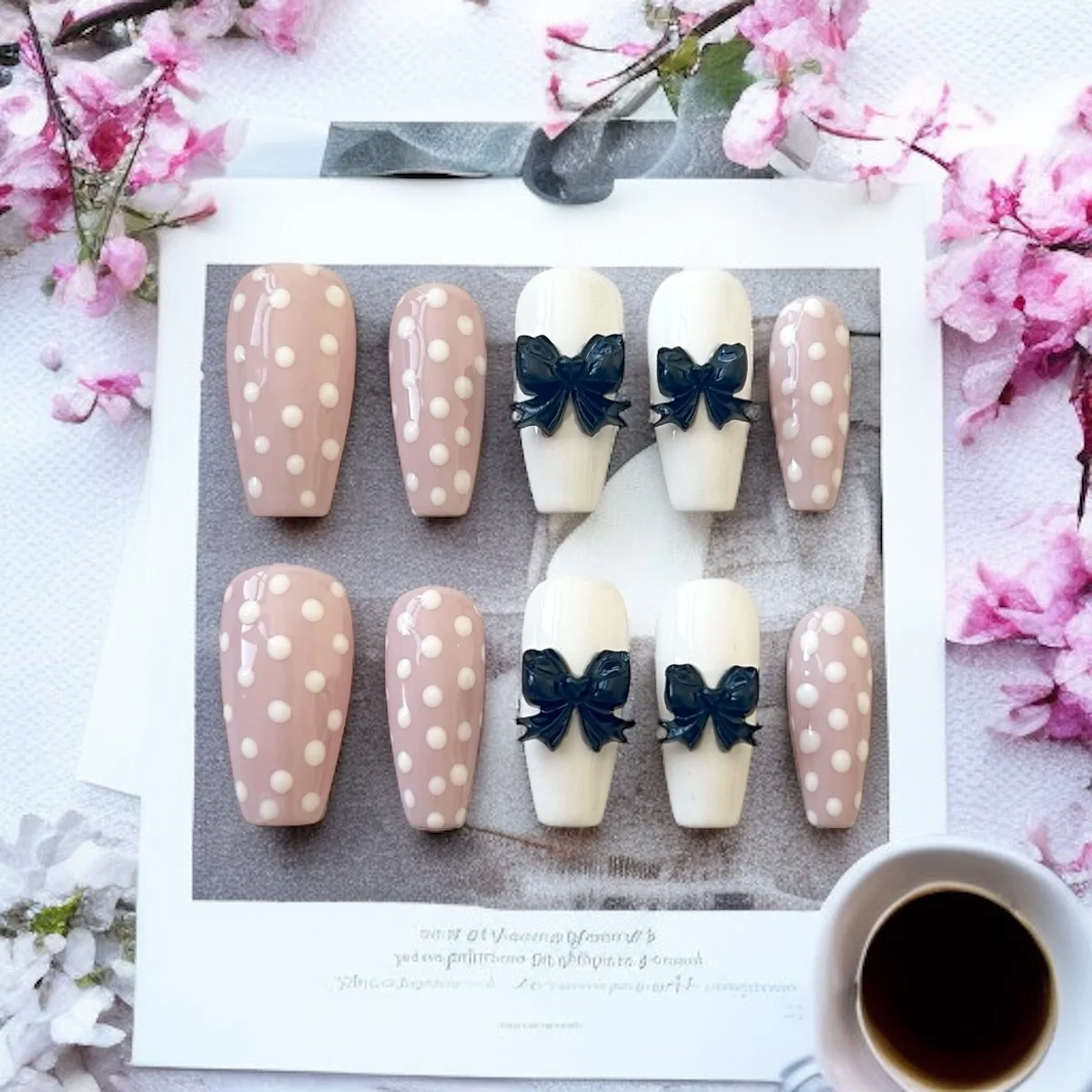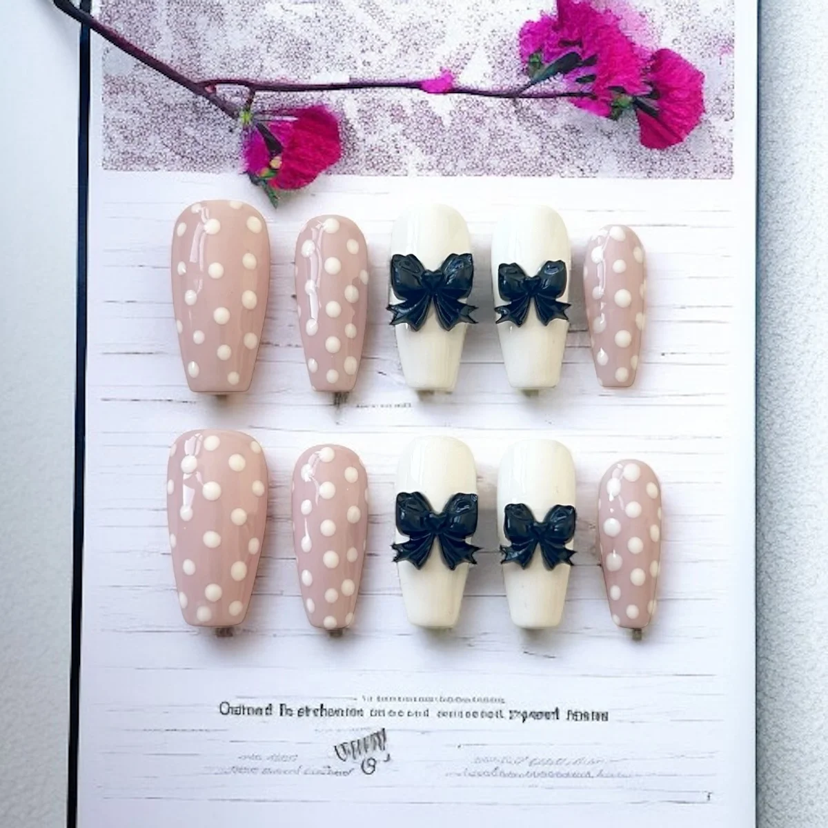 💅 Color: Soft nude-pink base with white polka dots, and off-white accents
