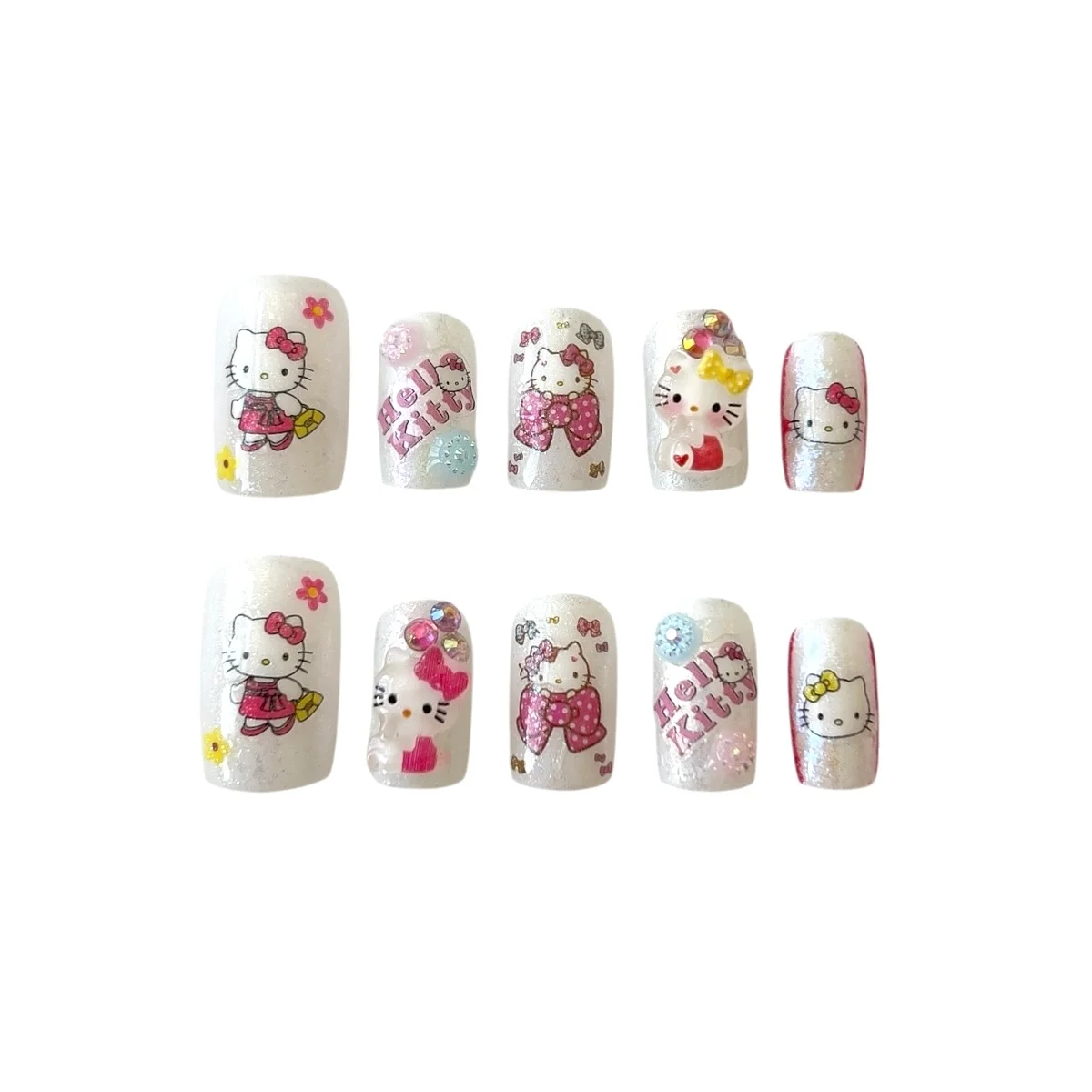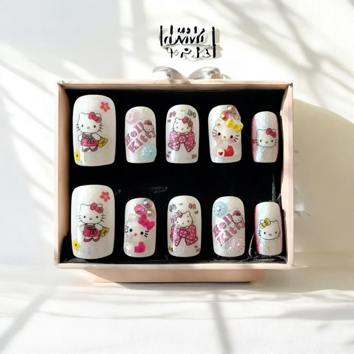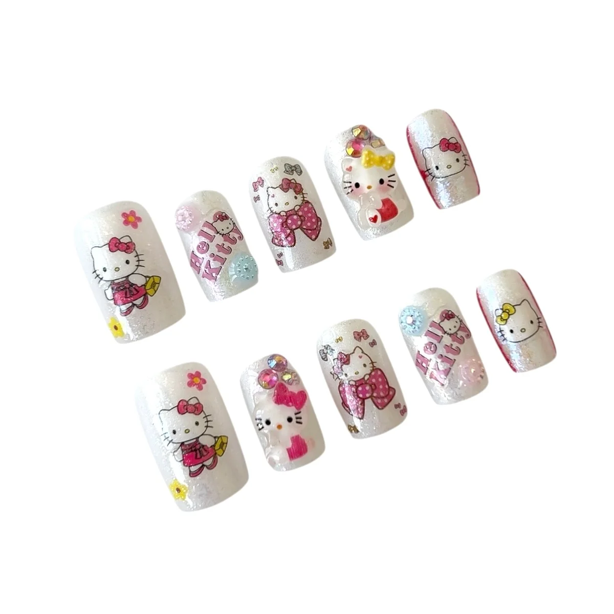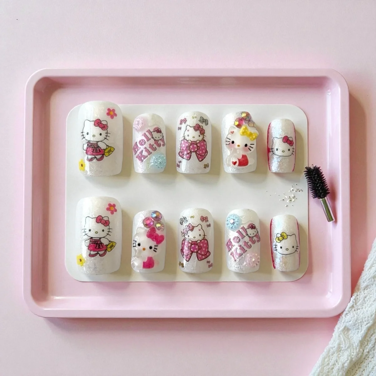 🫧 Effect: Playful kawaii effect featuring printed Hello Kitty graphics, mini bows, tiny flowers, and crystal accents.
