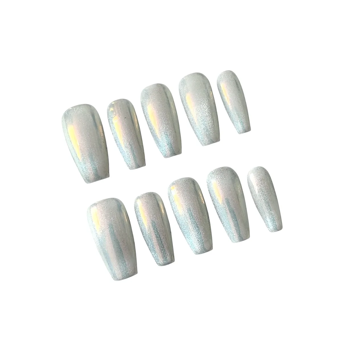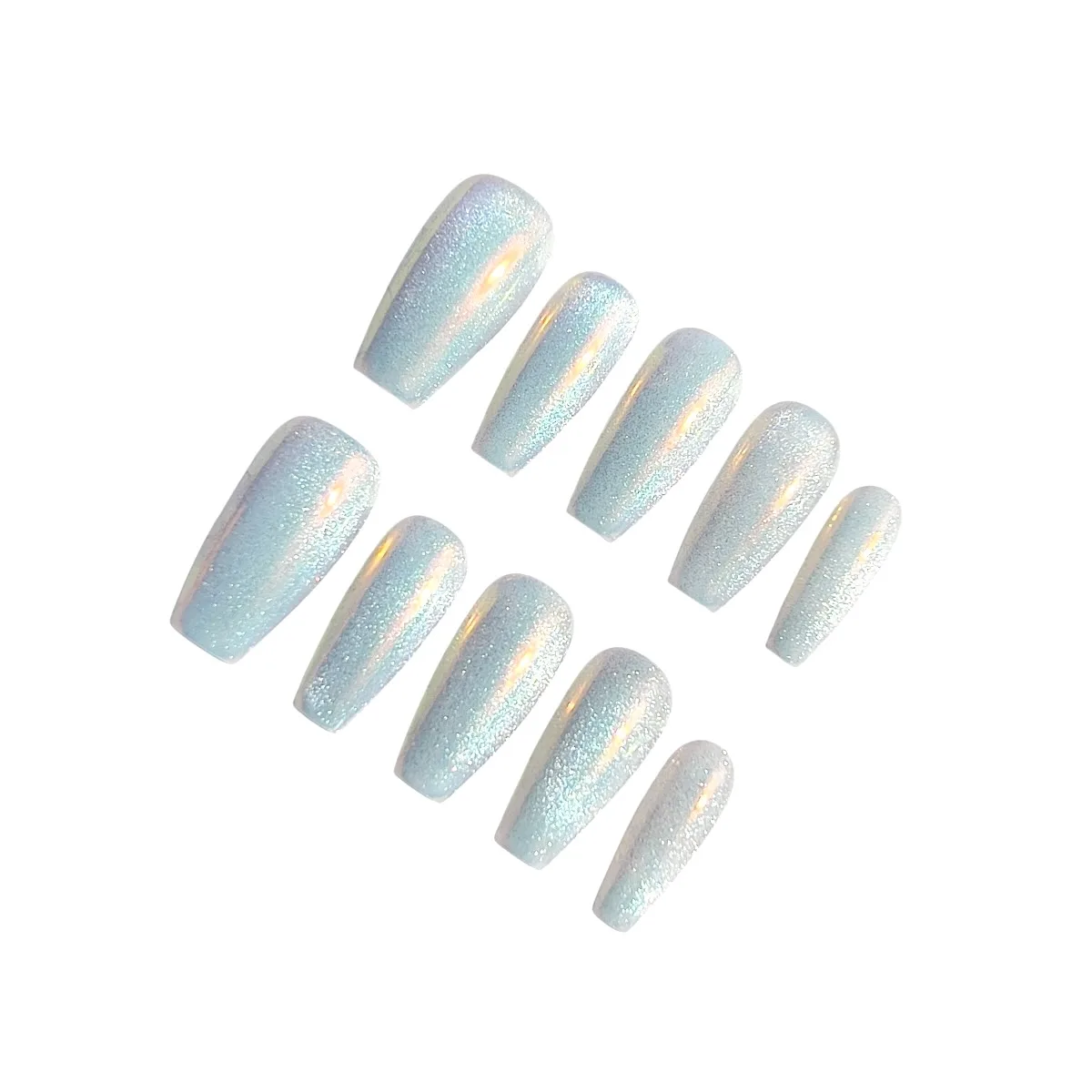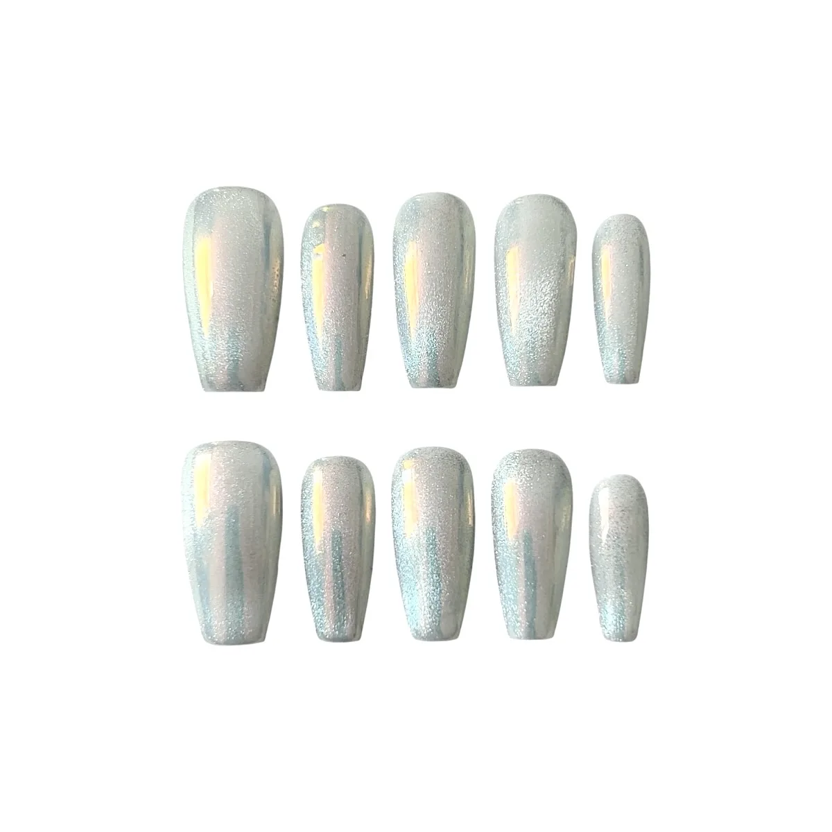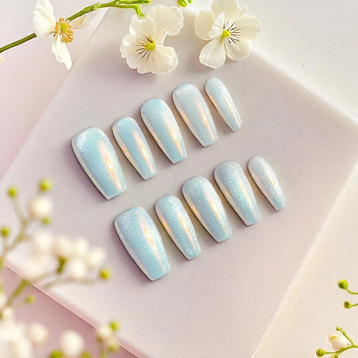 💅 Color: Iridescent white, with aqua blue, and soft orange holographic reflections