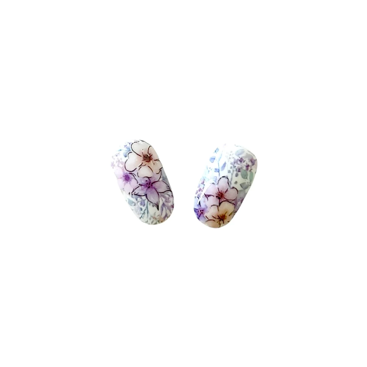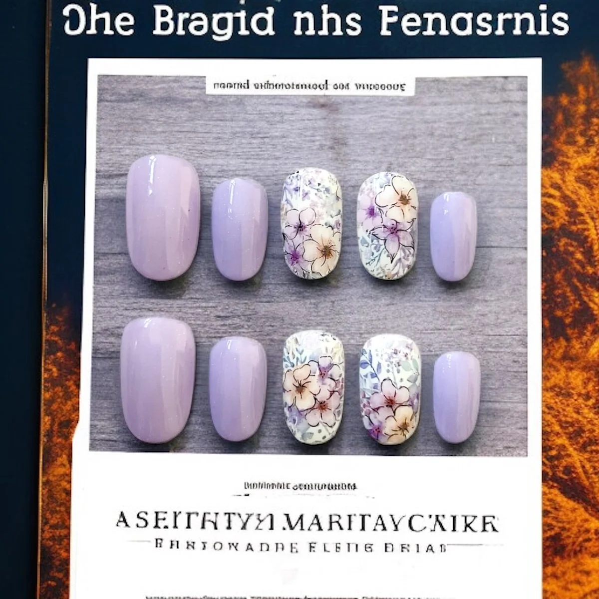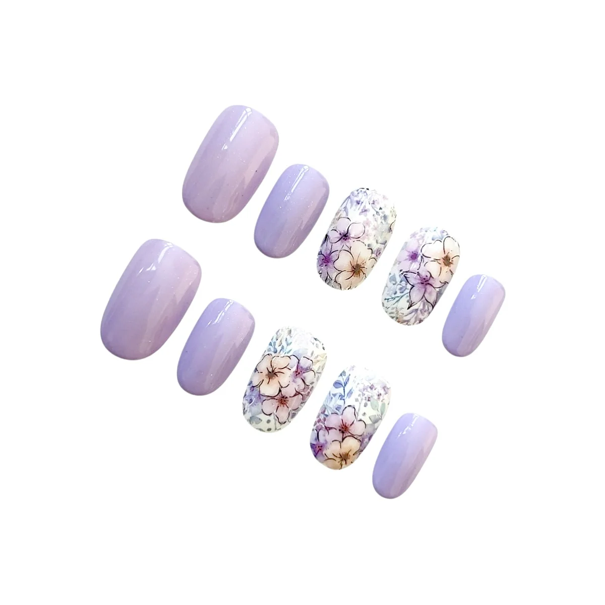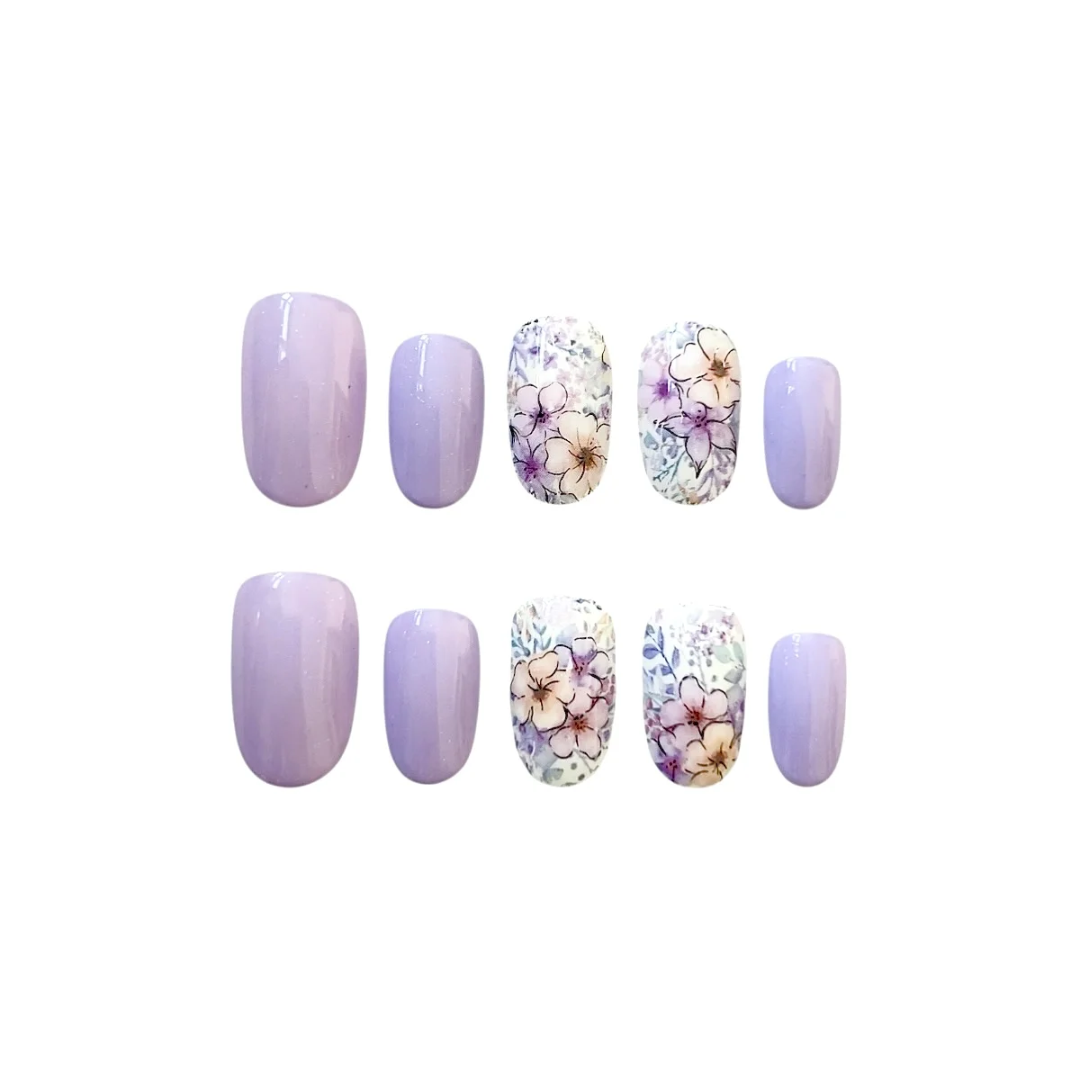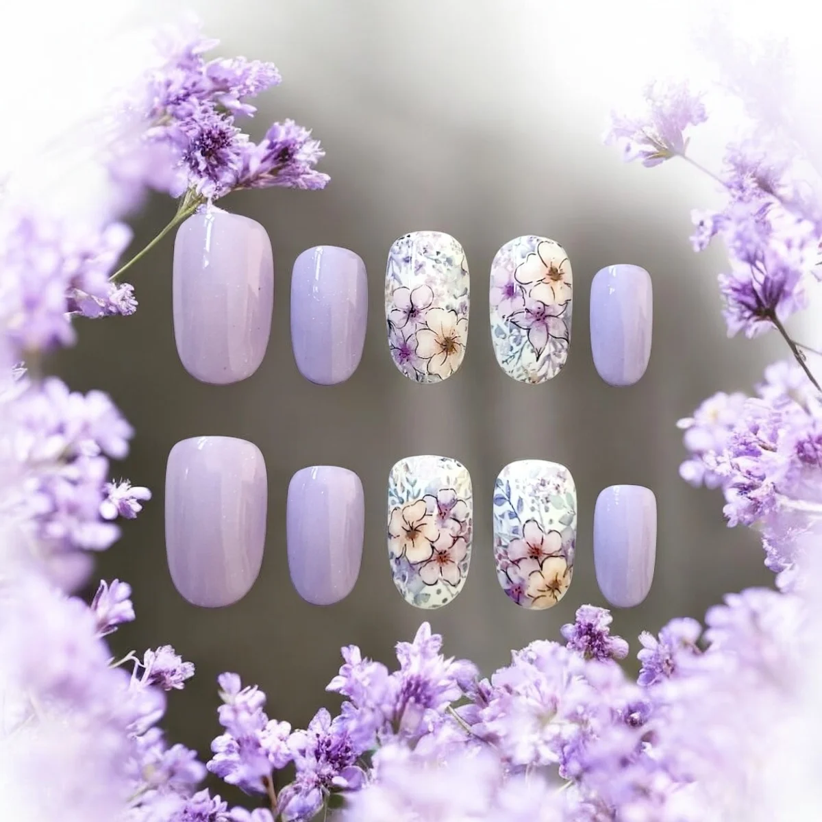 💅 Color: Soft lilac and white bases, with blush and violet floral print