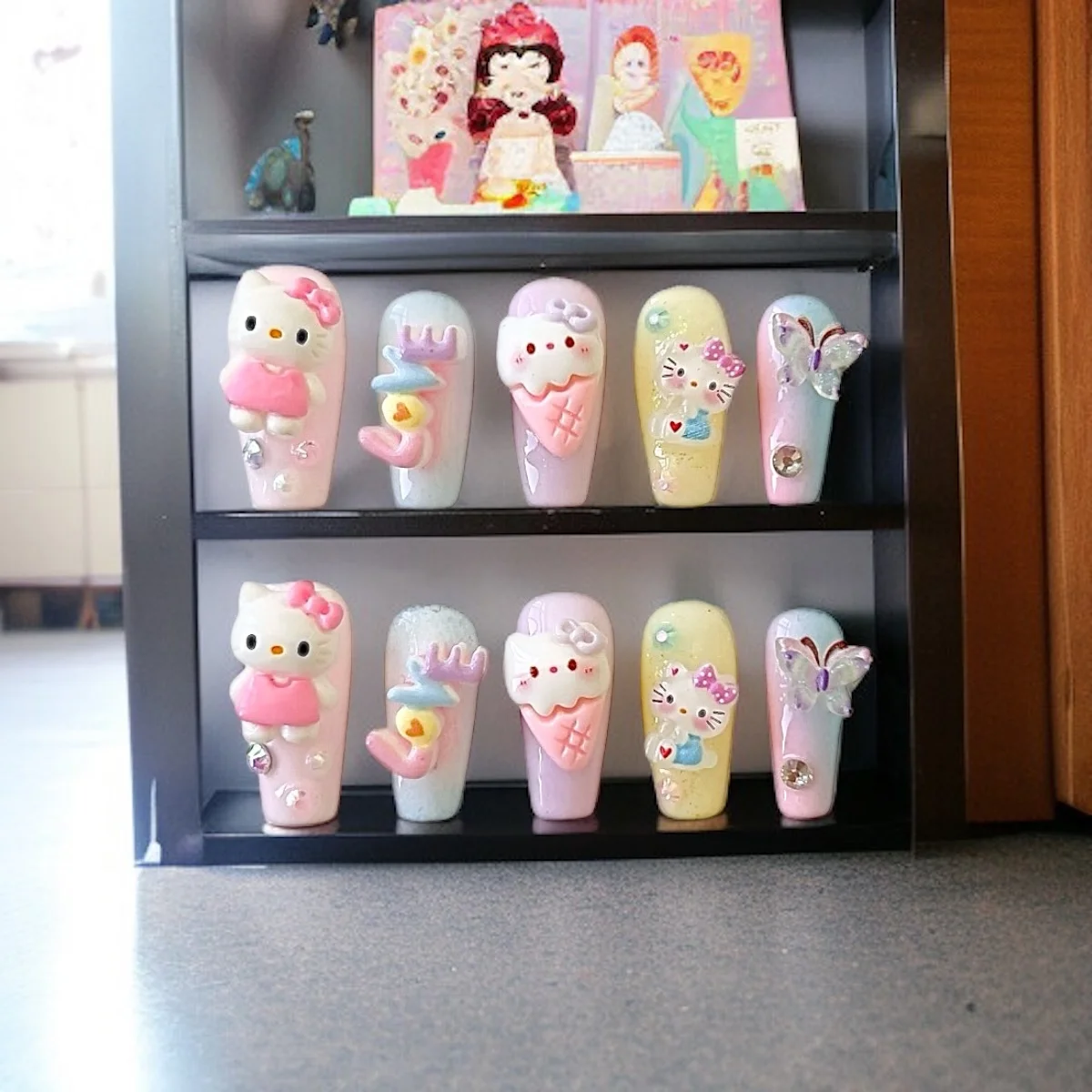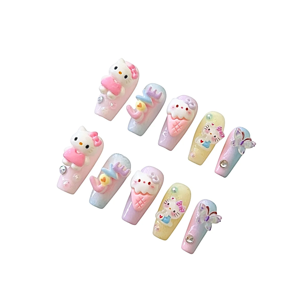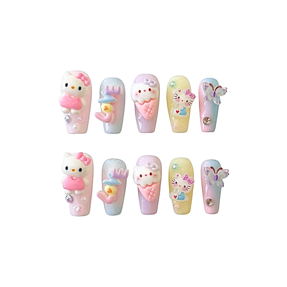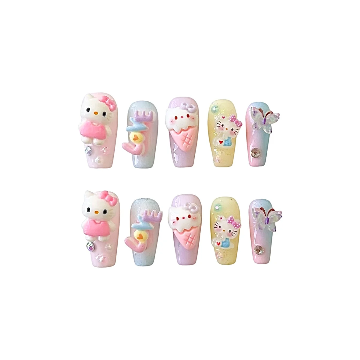 🫧 Effect: 3D kawaii charms with Hello Kitty figures, ice-cream cones, playful curls, butterflies, and tiny crystals