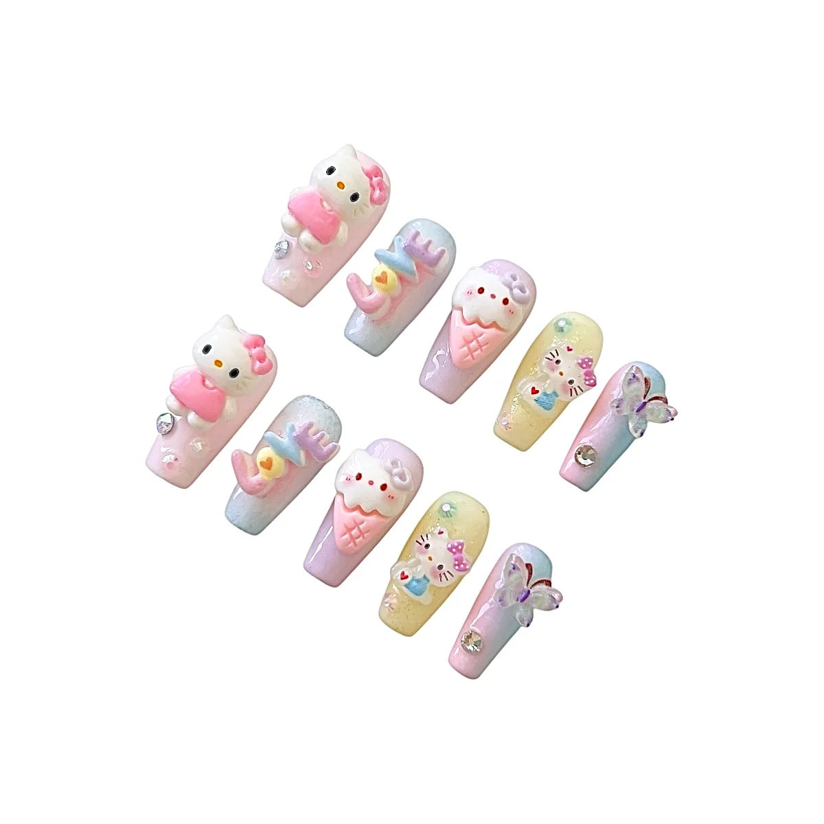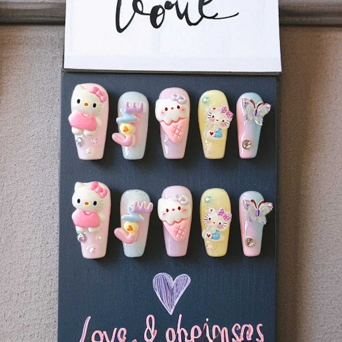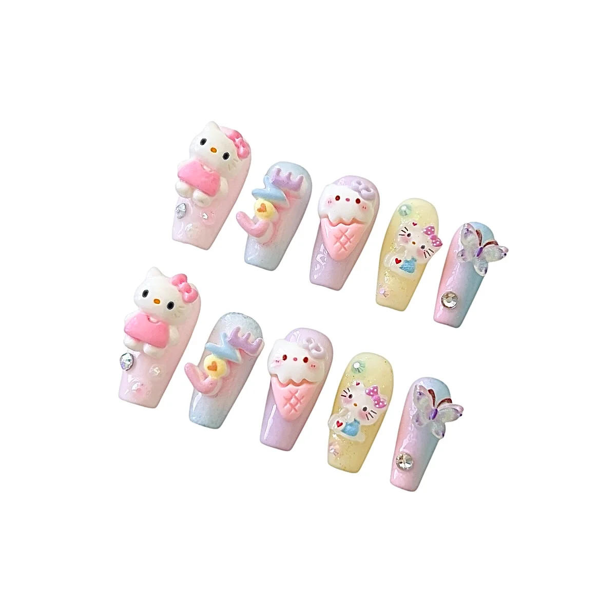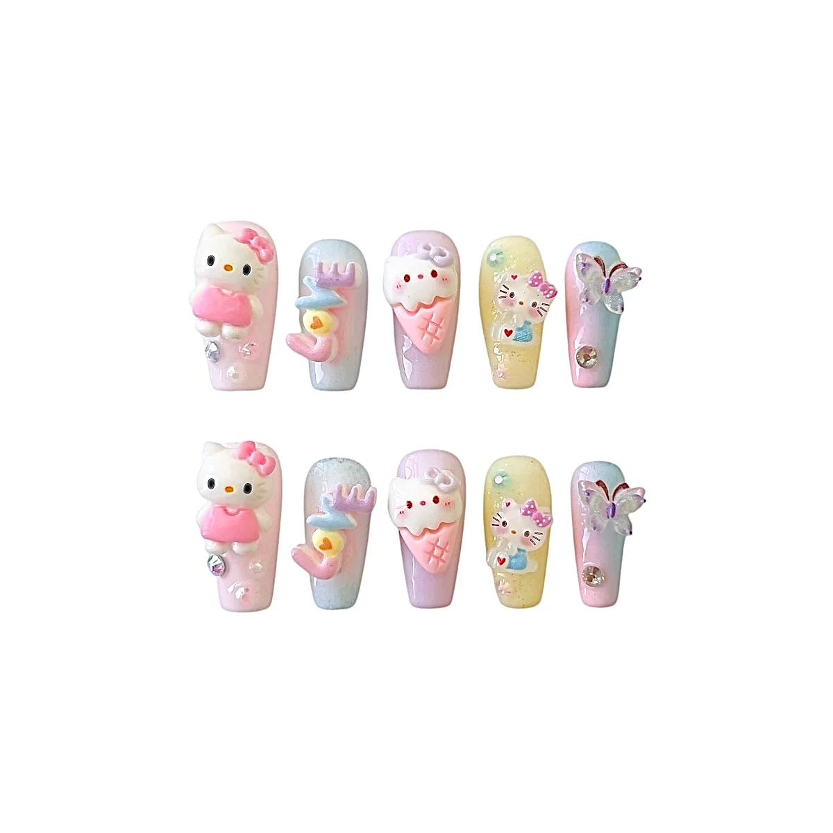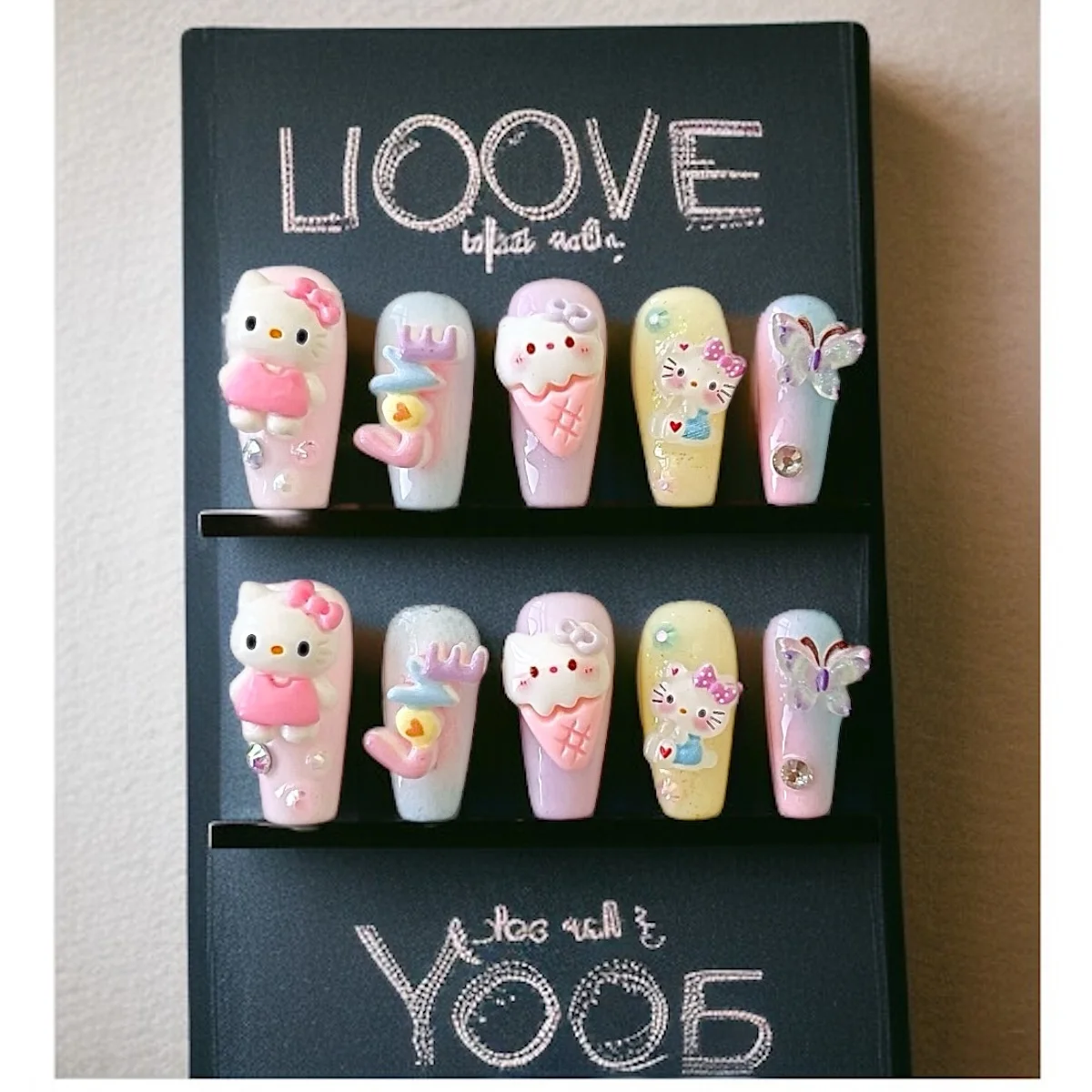 🫧 Effect: 3D kawaii charms with Hello Kitty figures, ice-cream cones, playful curls, butterflies, and tiny crystals