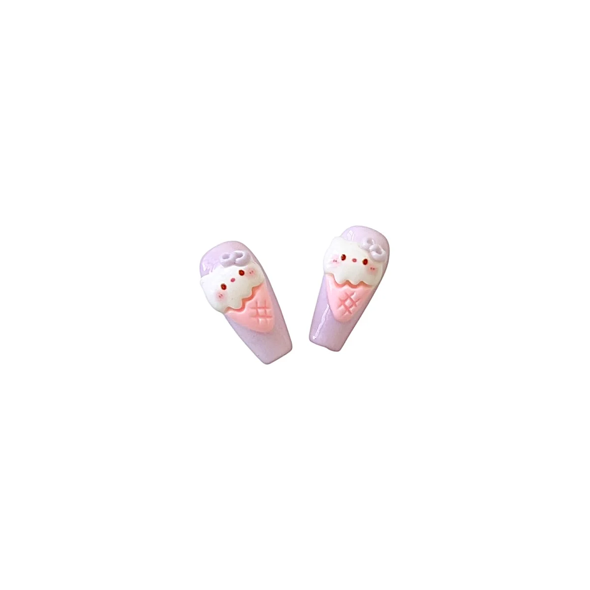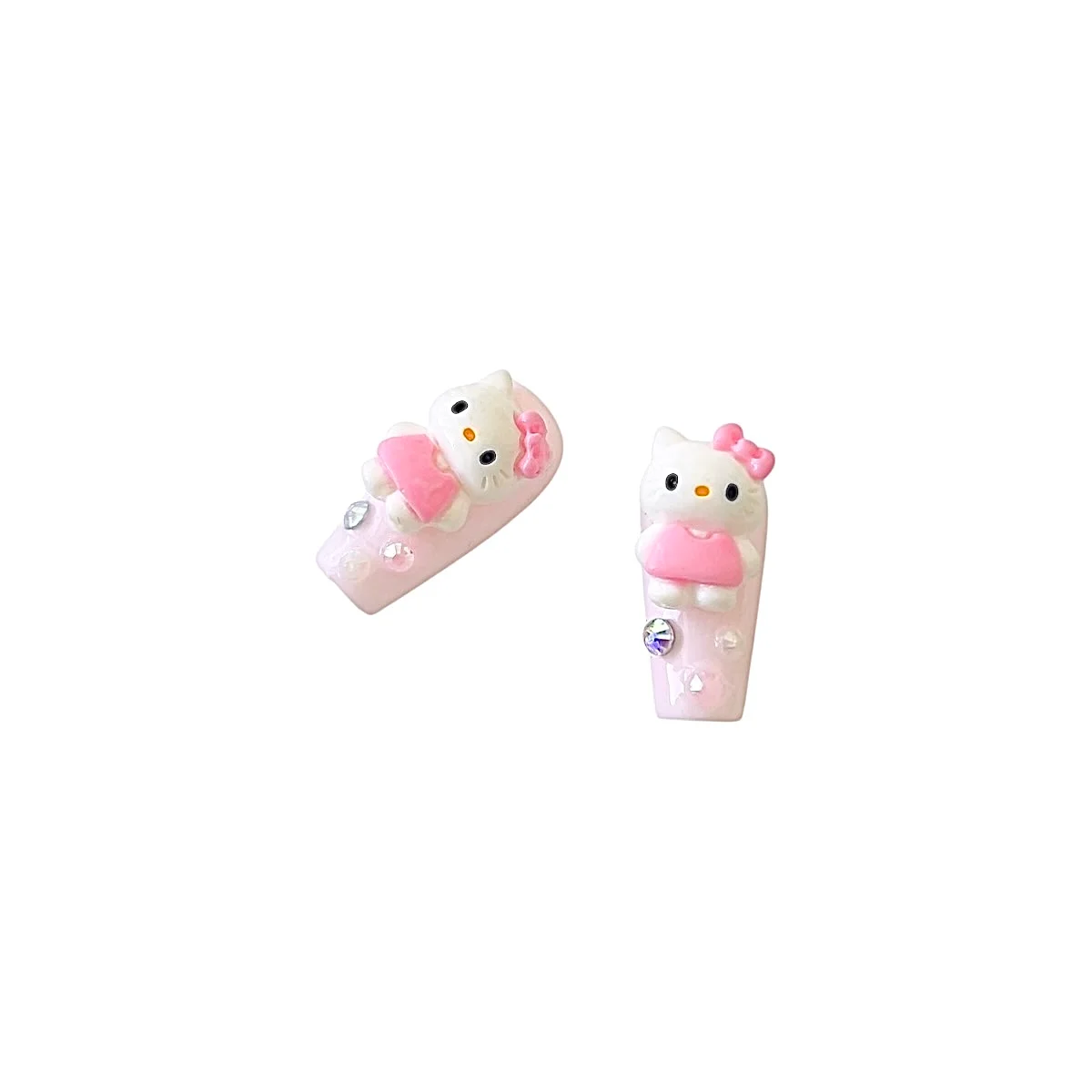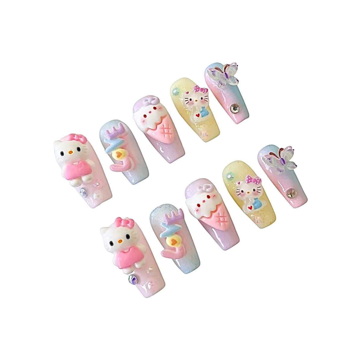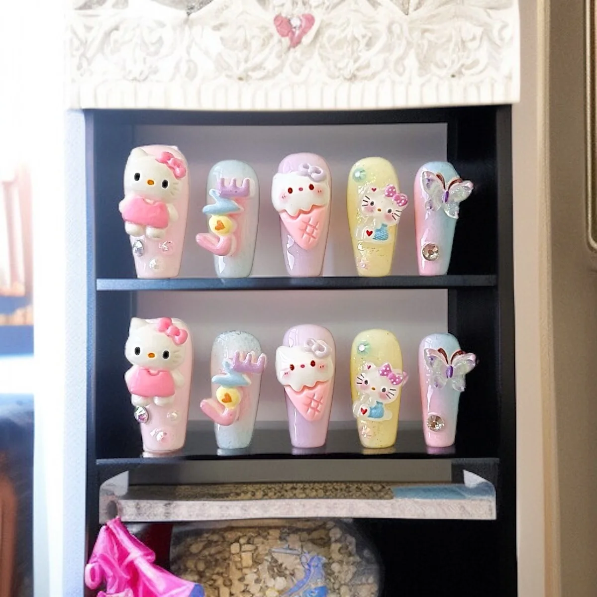 🫧 Effect: 3D kawaii charms with Hello Kitty figures, ice-cream cones, playful curls, butterflies, and tiny crystals