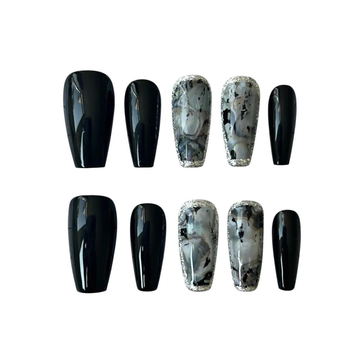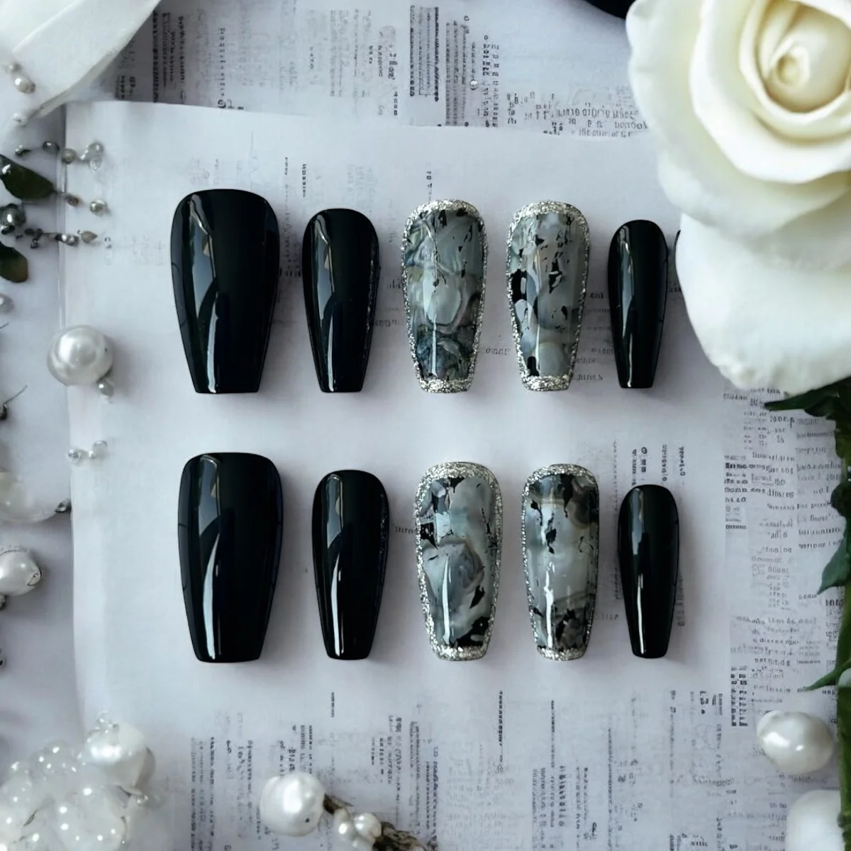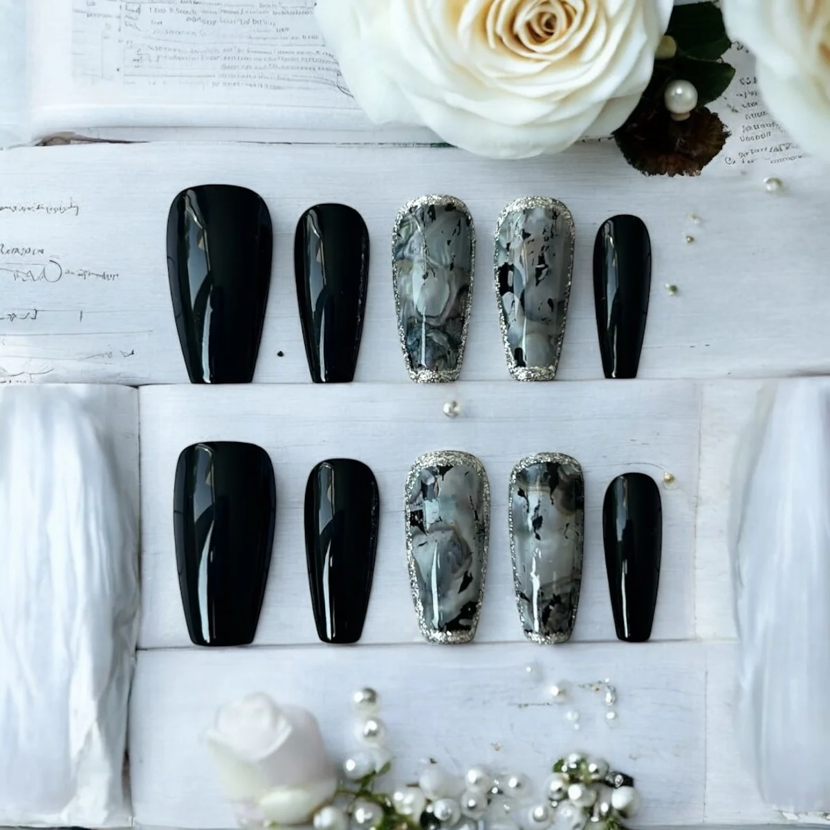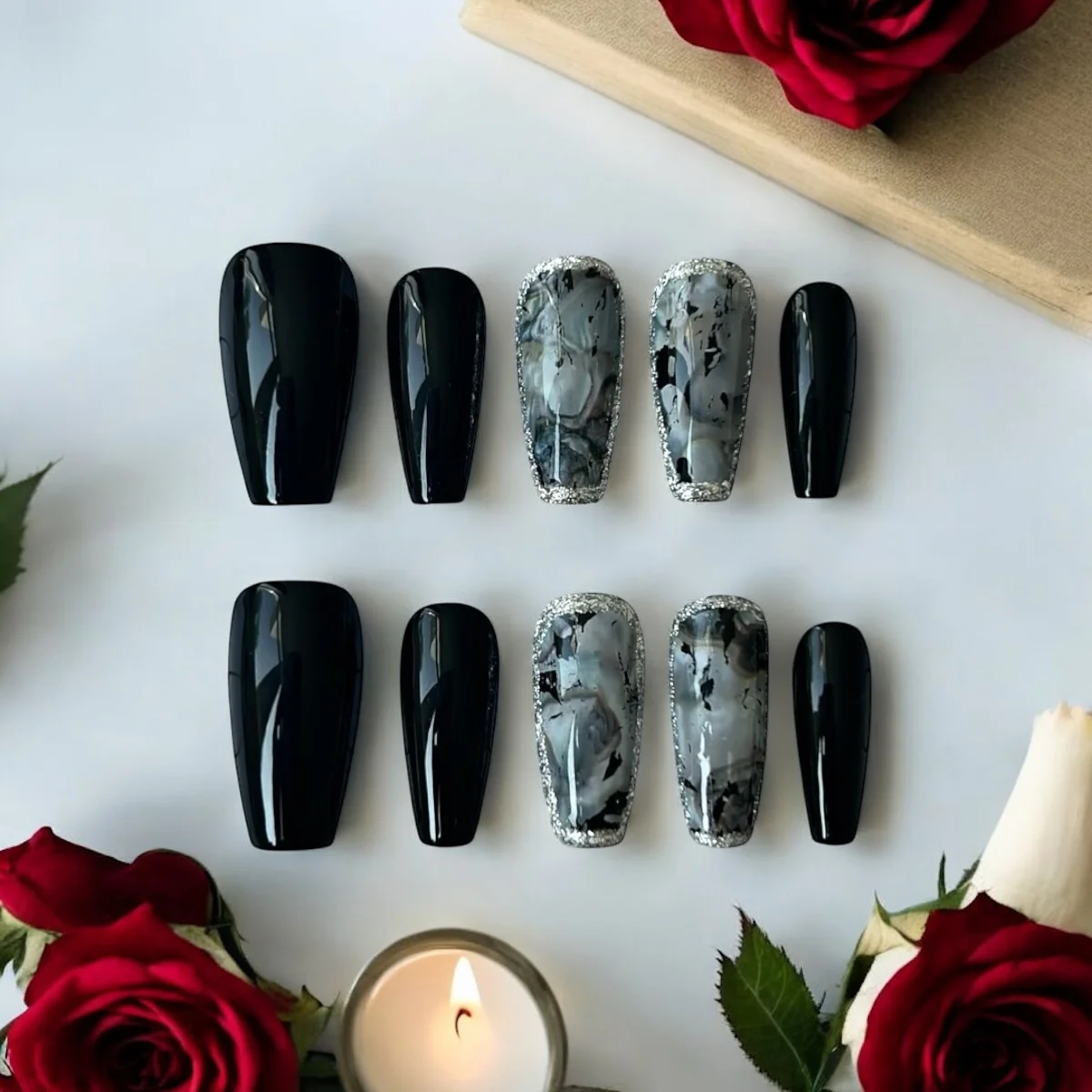 💅 Color: A bold black paired with stormy grey marble, and silver micro-glitter