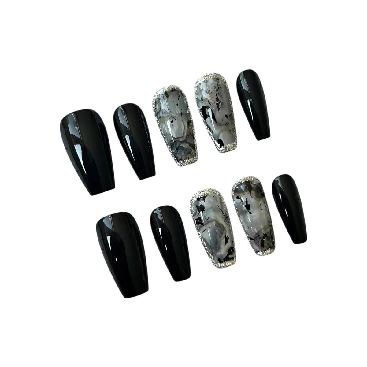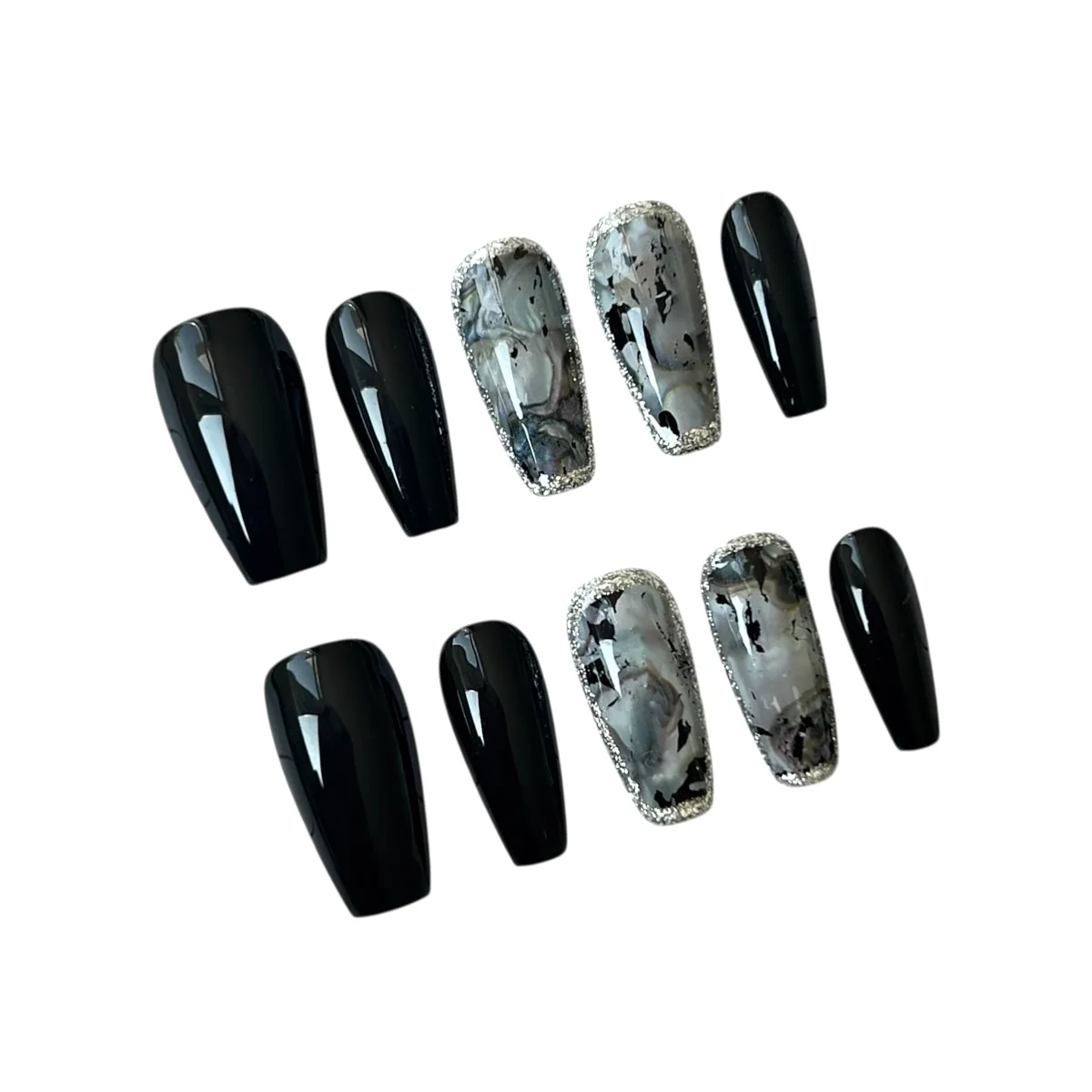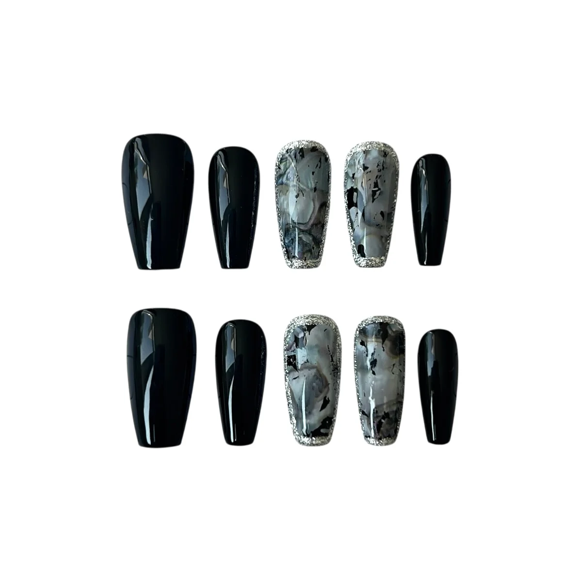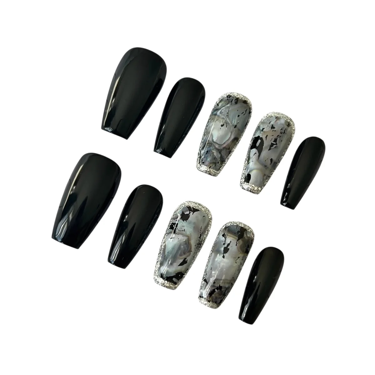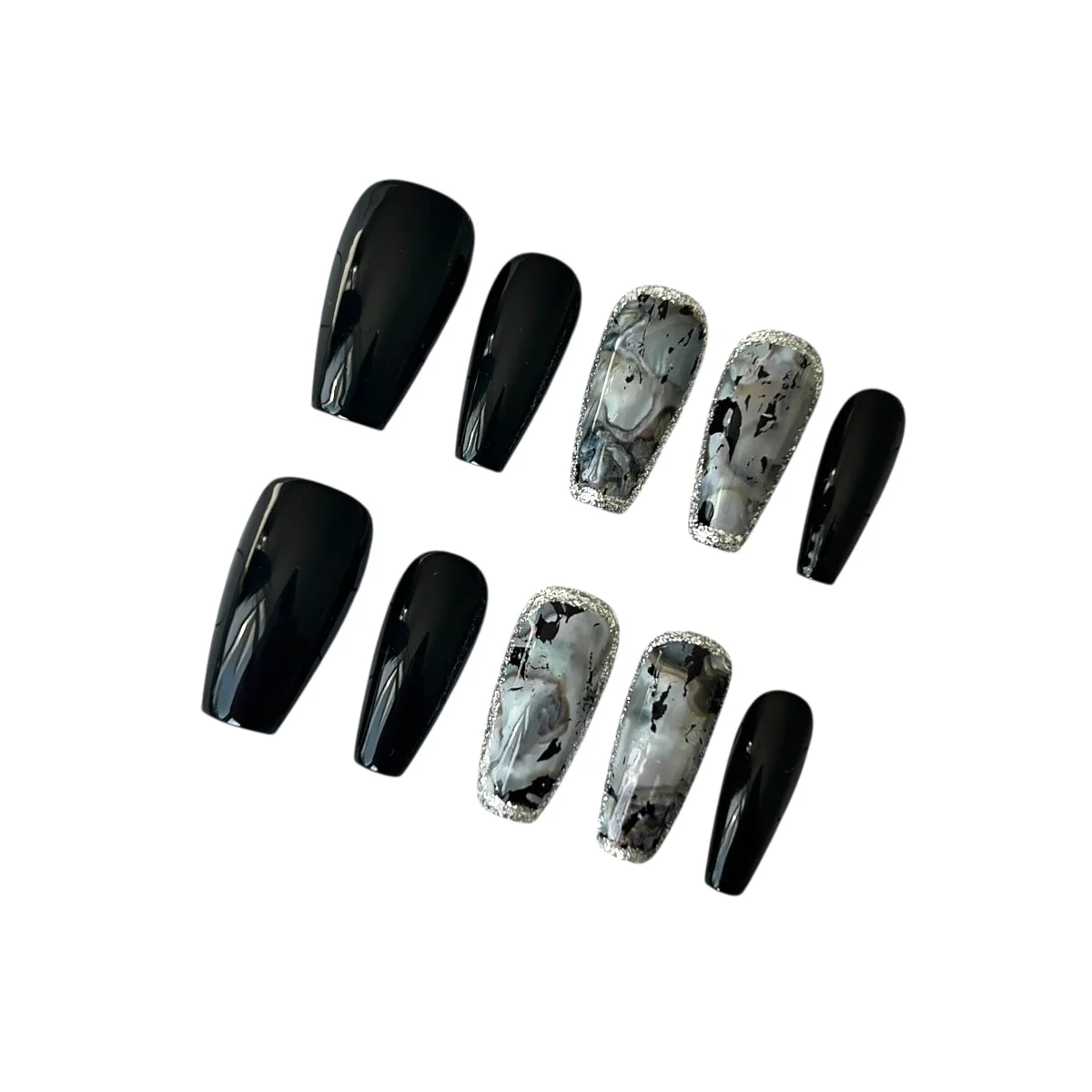 💅 Color: A bold black paired with stormy grey marble, and silver micro-glitter