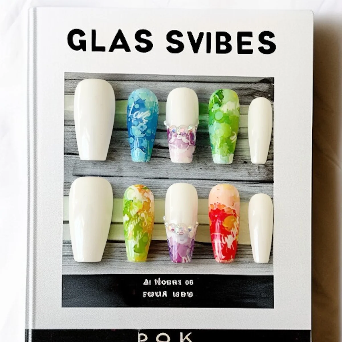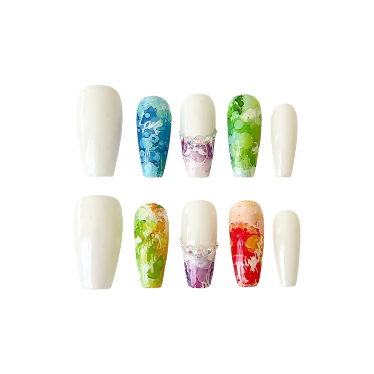 🫧 Effect: Abstract “artist’s palette” effect—fluid splashes and layered drops that look hand-painted and unique on every nail. Selected nails feature a curved band of iridescent crystals