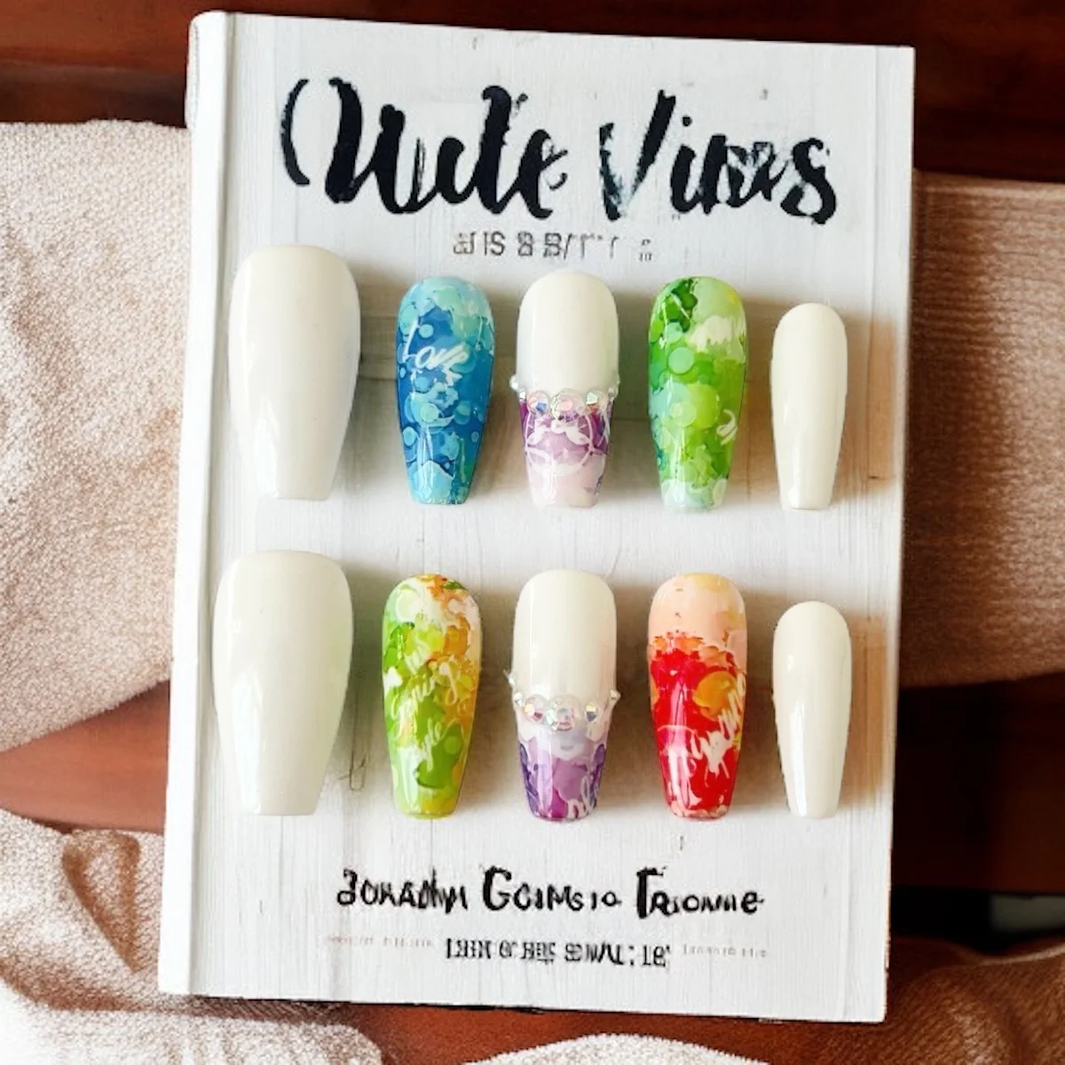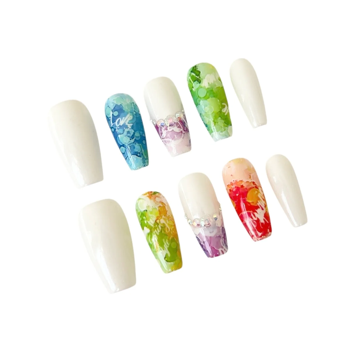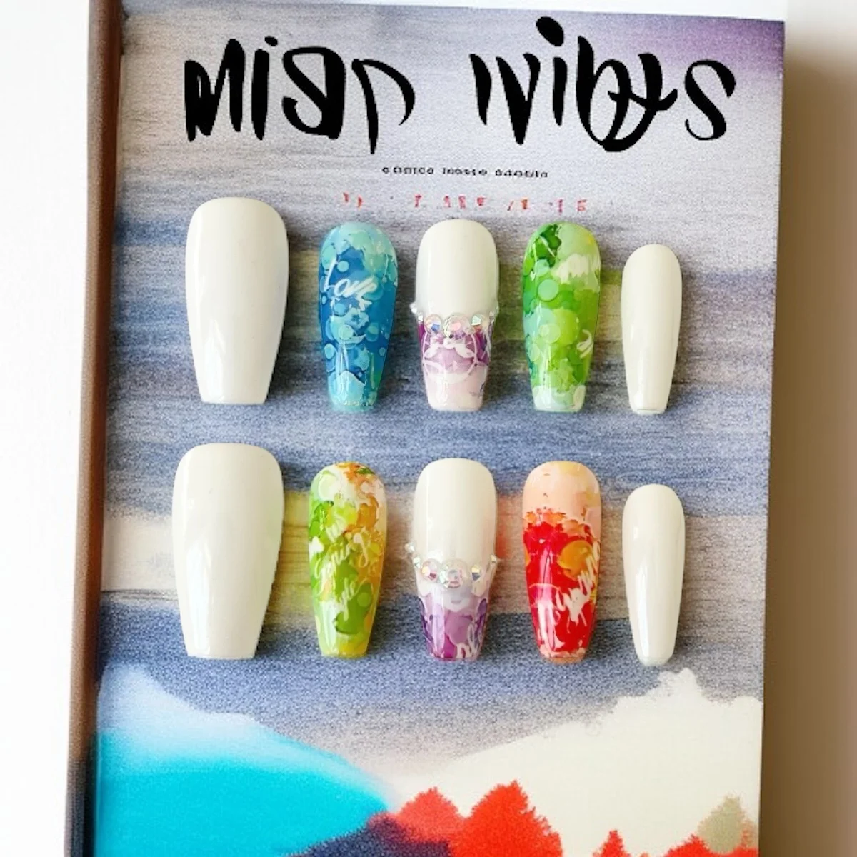💅 Color: A white base paired with vivid watercolor-style tips in ocean blue, leafy green, sunset orange, fiery red, and enchanted violet
