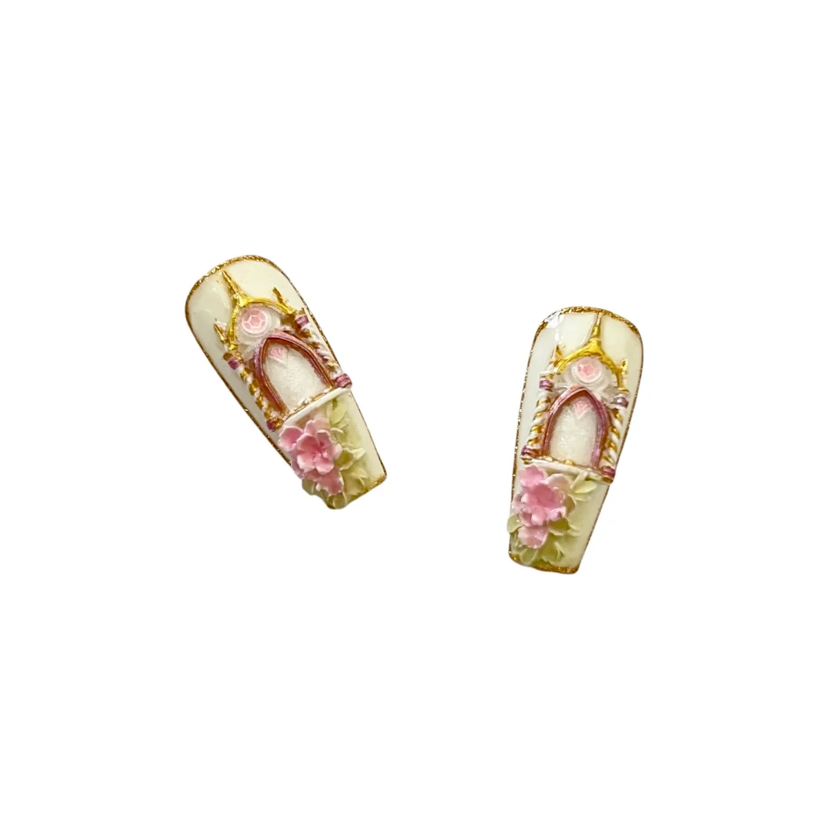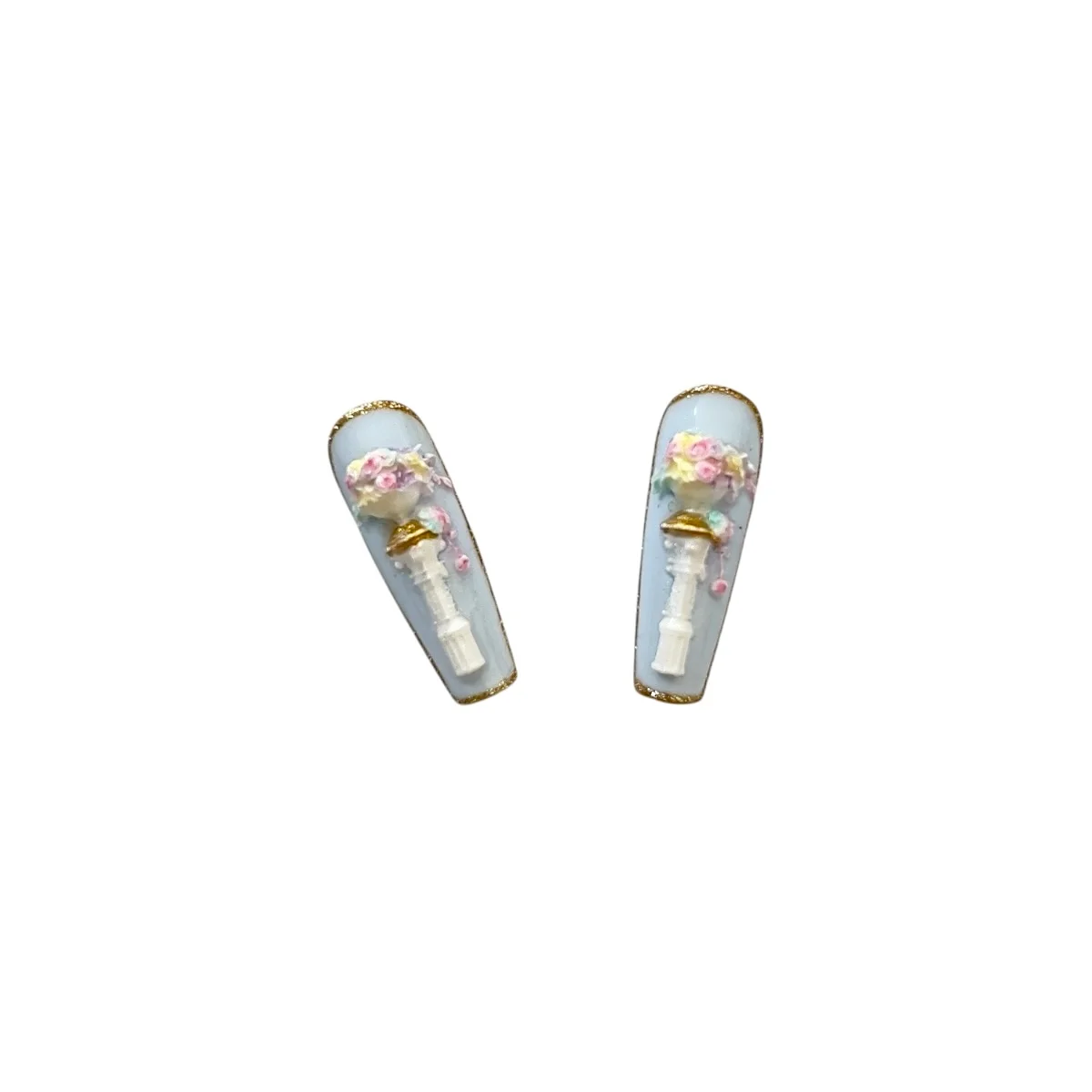 Its tall arches were trimmed with molten gold, where dawn always seemed to linger. Along the corridors, pale blue panels carried delicate carvings of flowers and lace. Marble pillars rose from the floor, their tops crowned with porcelain vases overflowing with blooms.
