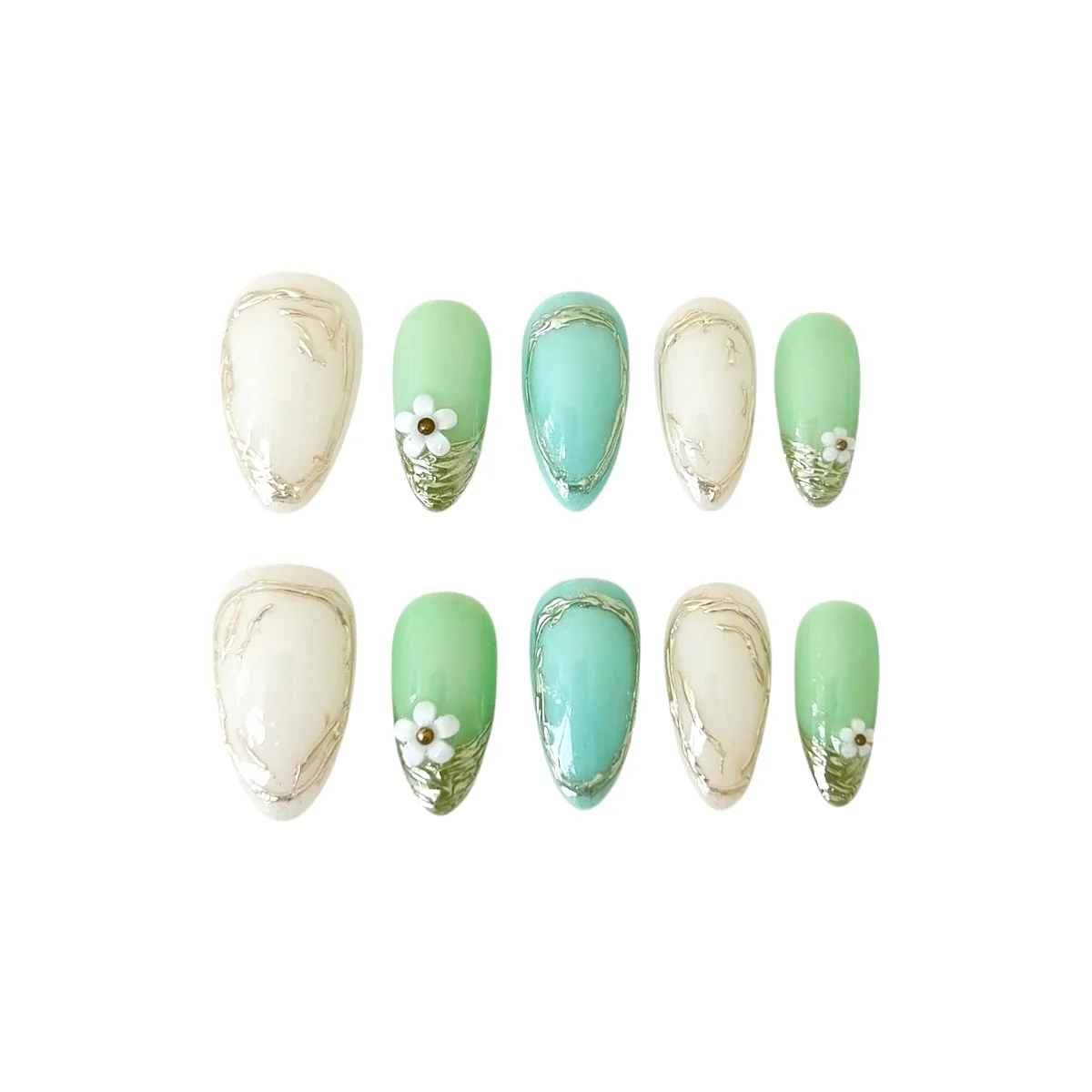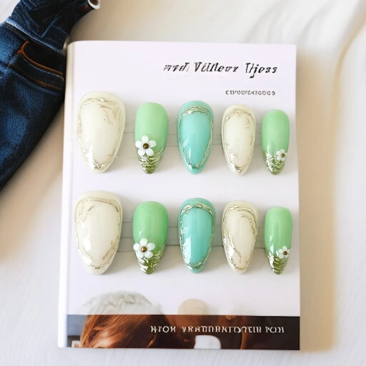 💅 Color: A soothing trio of royal shades: creamy ivory, milky mint green, and soft aqua blue