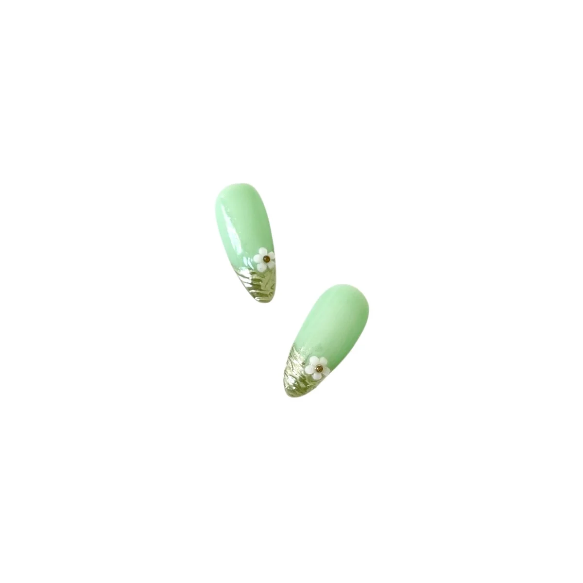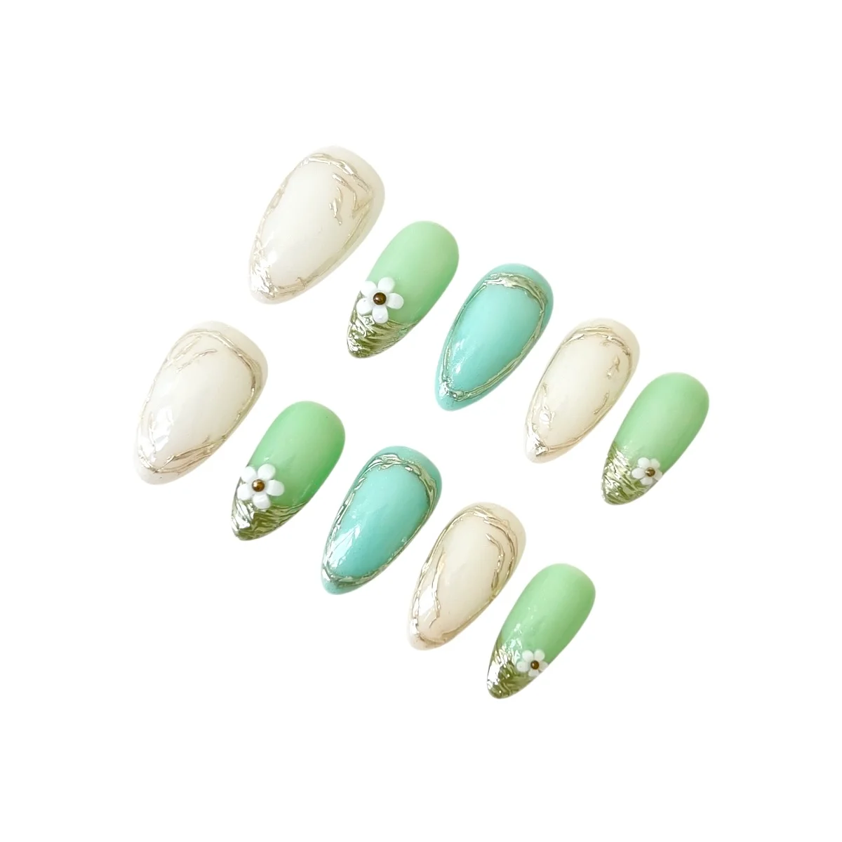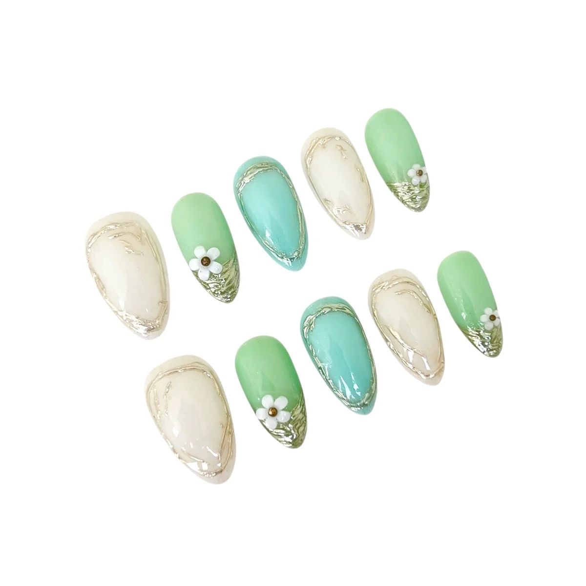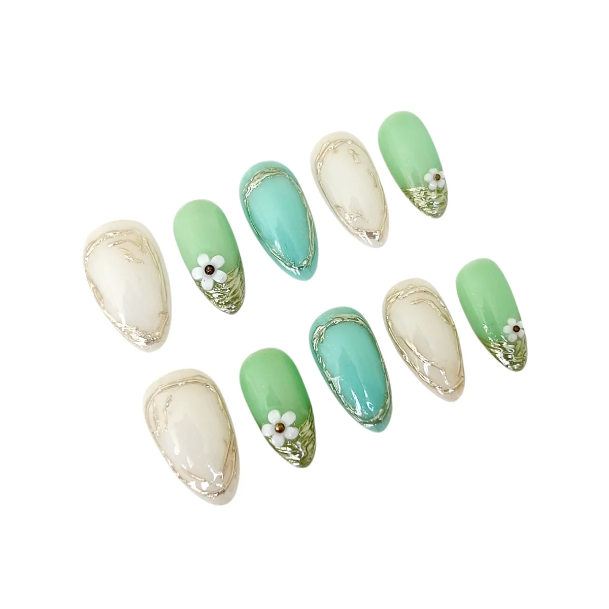 🫧 Effect: Elegant metal detailing in a soft gold. Some nails feature gold pooled at the free edge, others framed in a soft gold outline, with delicate 3D white flowers
