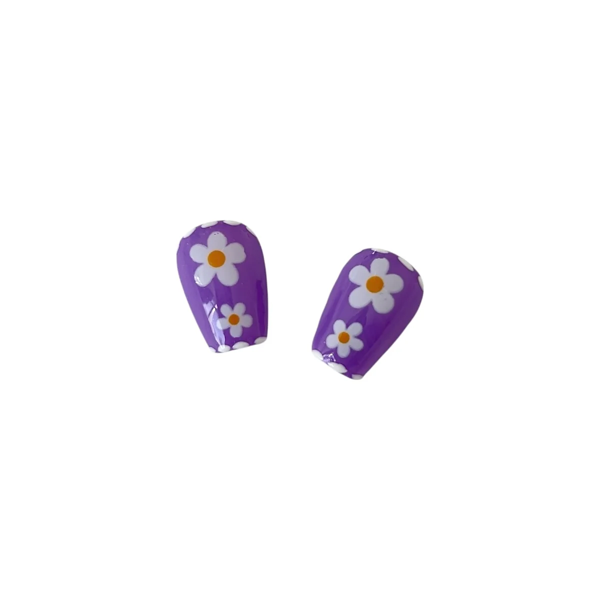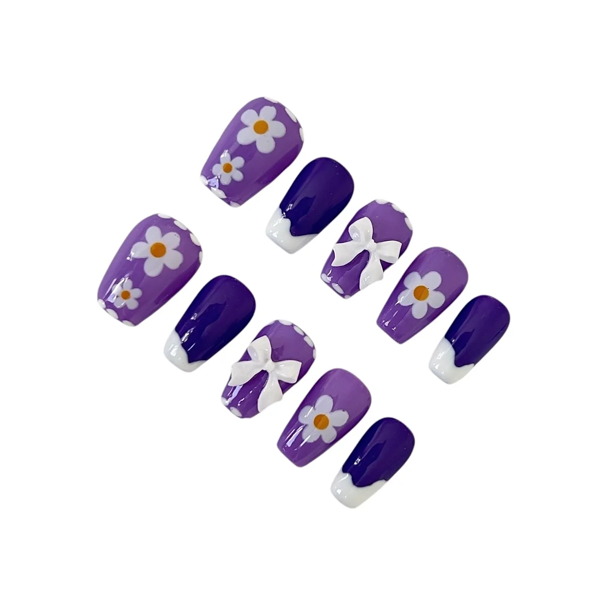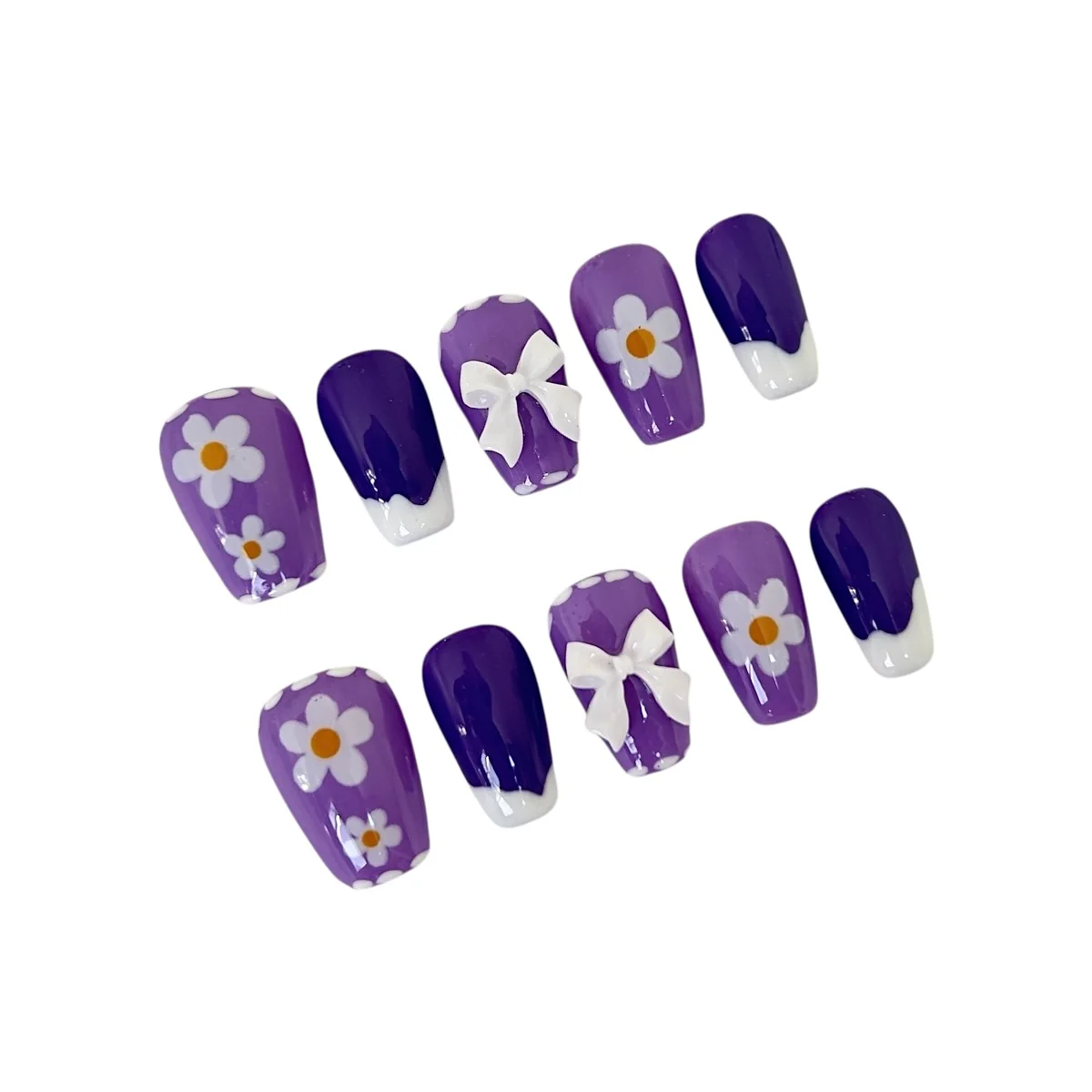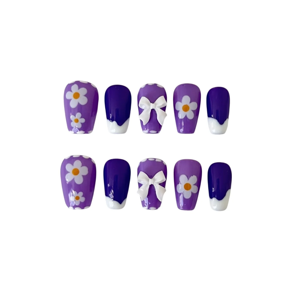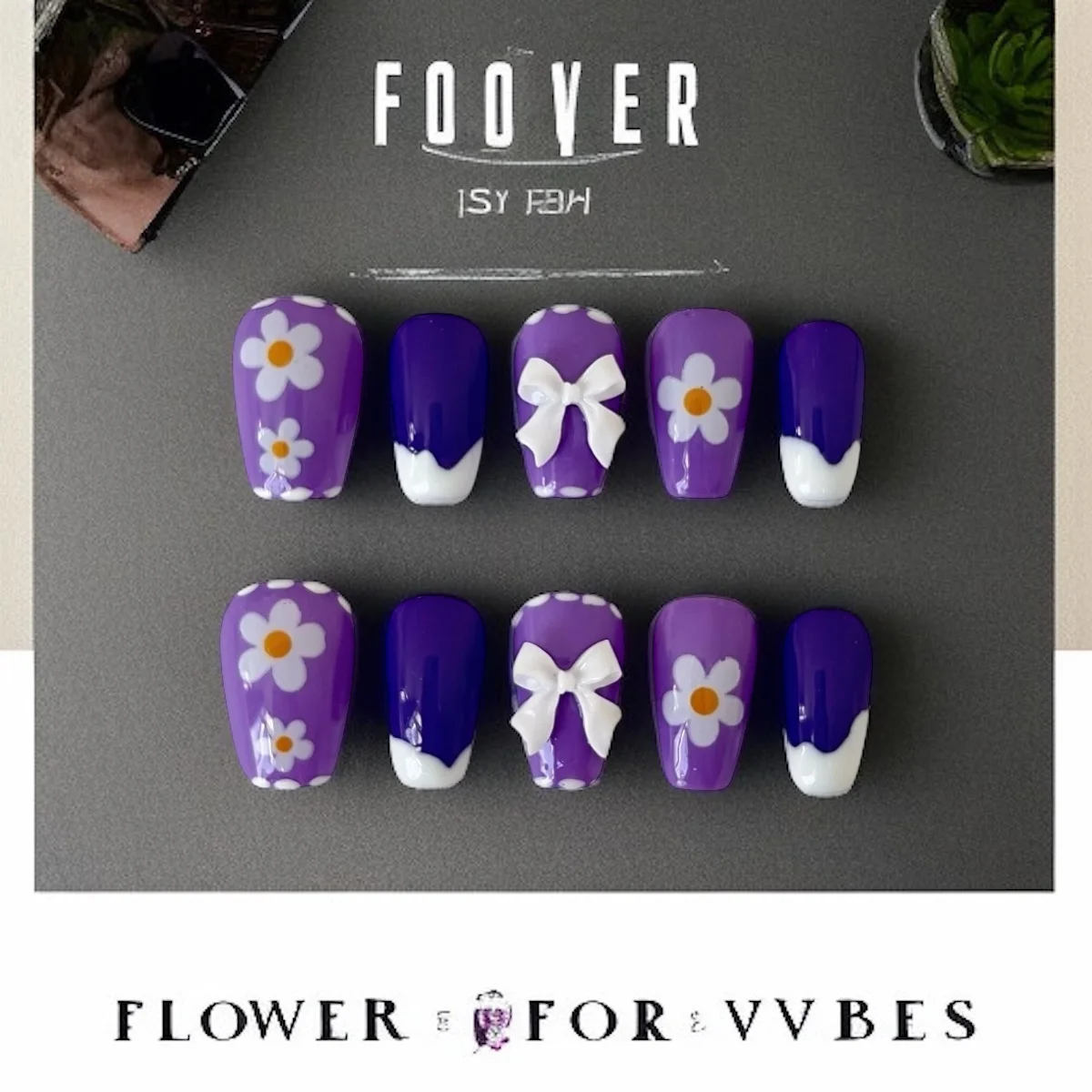 🫧 Effect: “Tropical night” effect. Some nails are fully purple with bold white daisies, or raised 3D white bows; others are darker purple and feature soft, wavy white tips that look like shoreline